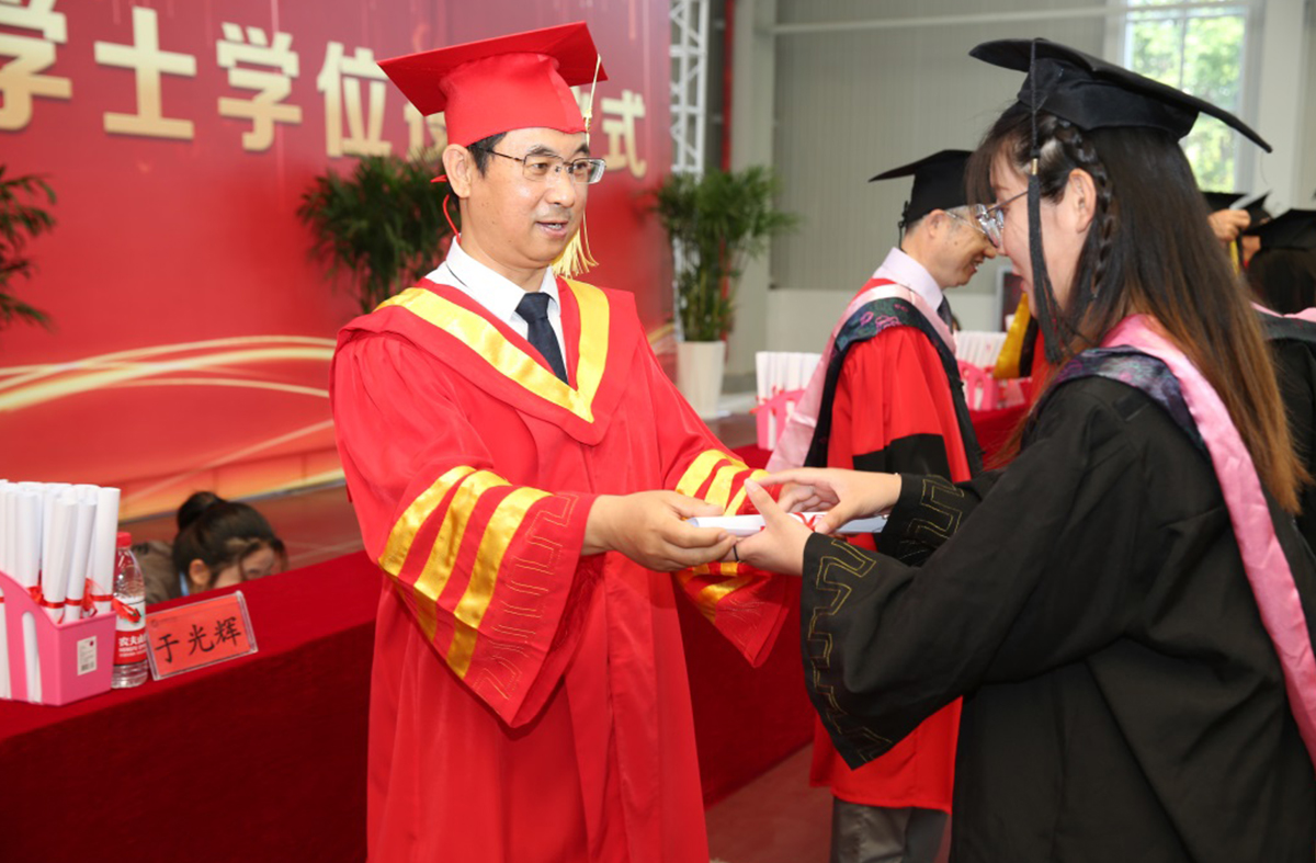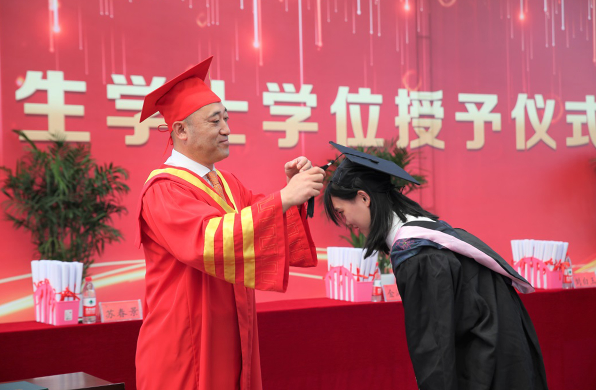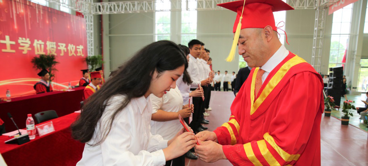 大會最后,辛軍董事長、煙臺理工學院校領導及導師為獲得學士學位的畢業(yè)生頒發(fā)證書,扶正流蘇并合影留念。
