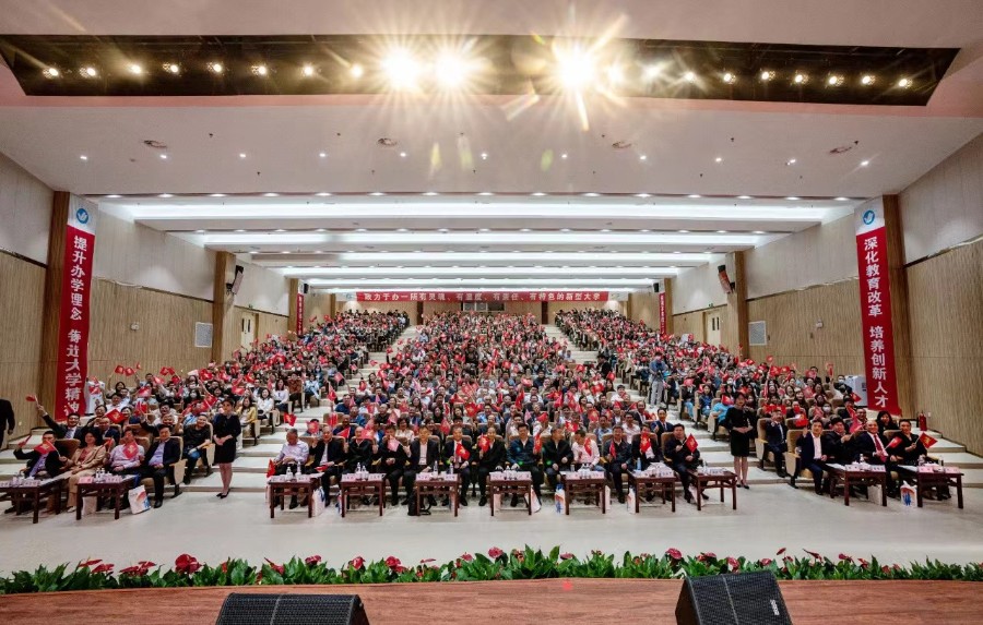 校長于光輝作了題為《不忘初心 砥礪前行 奮力實(shí)現(xiàn)學(xué)校高質(zhì)量發(fā)展新跨越》的工作匯報(bào)。報(bào)告指出,辦學(xué)20年來,學(xué)校發(fā)展經(jīng)歷了攻堅(jiān)克難的依附創(chuàng)設(shè)期、強(qiáng)基固本的依托轉(zhuǎn)型期和乘勢(shì)而上的獨(dú)立發(fā)展期,學(xué)校校名經(jīng)歷了從煙臺(tái)大學(xué)文經(jīng)學(xué)院到煙臺(tái)理工學(xué)院的歷史變遷;總結(jié)了學(xué)校在黨建思政、辦學(xué)規(guī)模、教學(xué)改革、科研與服務(wù)社會(huì)、師資隊(duì)伍建設(shè)、對(duì)外交流、人才培養(yǎng)等方面取得的成績(jī),展望了學(xué)校“三步走”戰(zhàn)略的美好前景,表達(dá)了對(duì)教師、學(xué)生、校友和各界人士的美好祝福。他強(qiáng)調(diào),當(dāng)前和未來一個(gè)時(shí)期,面對(duì)高質(zhì)量發(fā)展重任,我們要以習(xí)近平新時(shí)代中國特色社會(huì)主義思想和黨的二十大精神為指引,規(guī)范辦學(xué)、和合發(fā)展,堅(jiān)定“雙六”辦學(xué)思路,培養(yǎng)“重品格、善溝通、能做事、會(huì)創(chuàng)新”的高素質(zhì)應(yīng)用型人才,努力建設(shè)“有靈魂、有溫度、有責(zé)任、有特色”的國內(nèi)同類院校水平領(lǐng)先的地方性應(yīng)用型大學(xué)。
