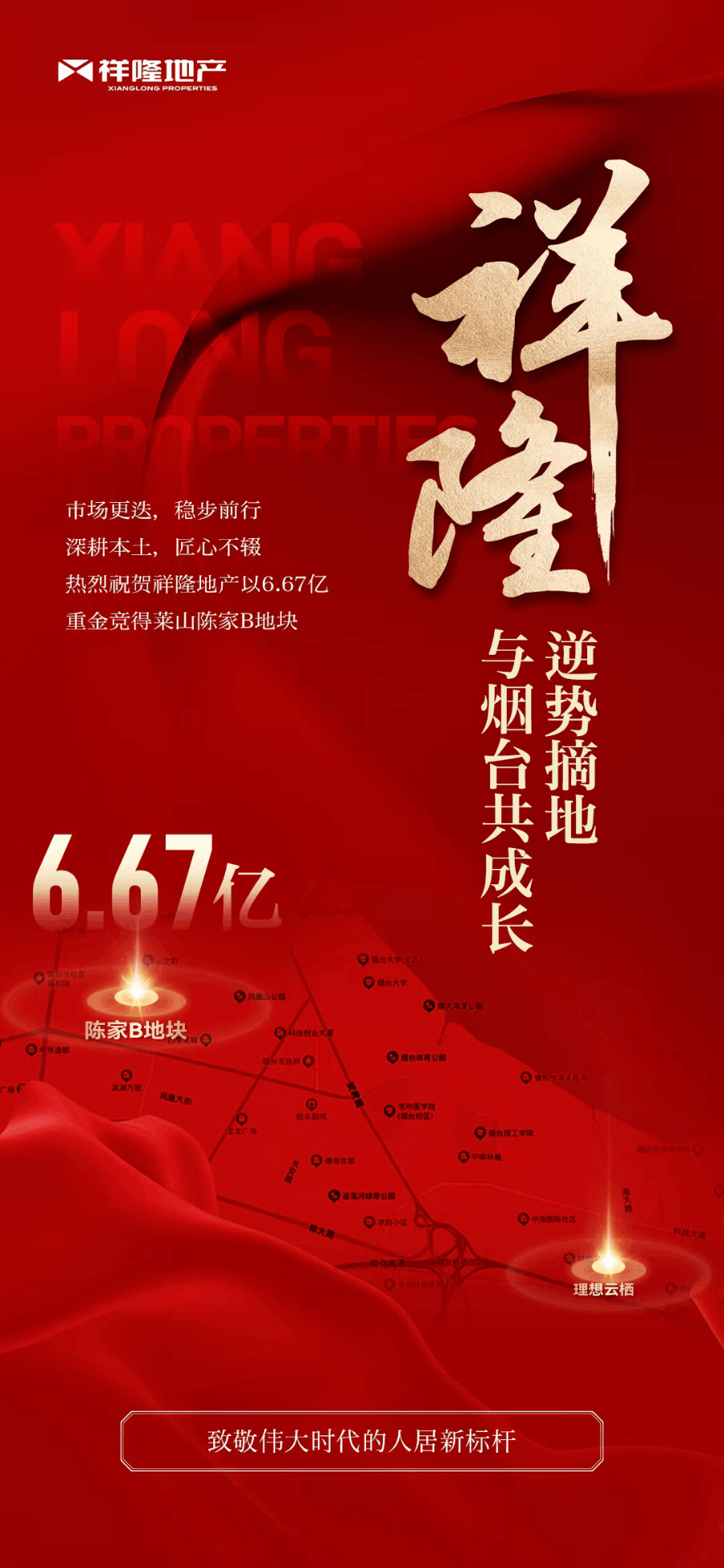 在市場行情入冬的情況下,在11月16日司慶同日,祥隆地產在煙臺東部區(qū)域以總價6.67億元成功斬獲新地塊,為祥隆企業(yè)集團28歲生日慶生,在恢弘版圖上再添璀璨一筆!